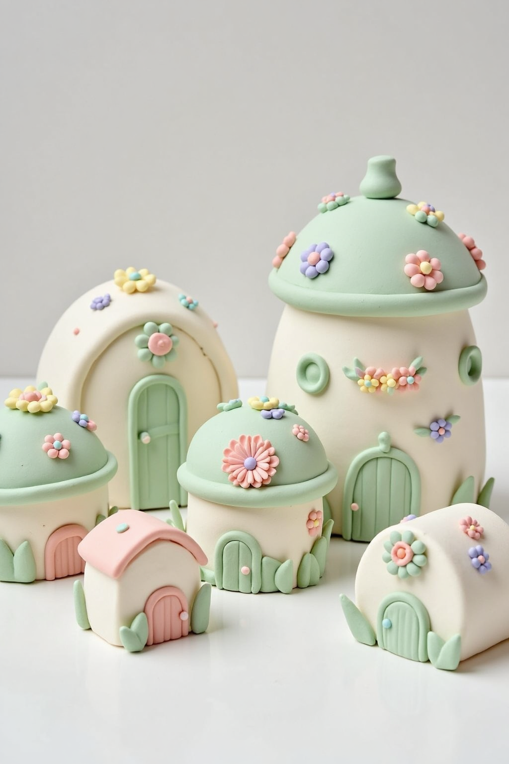 수제 점토 집 모델, 별 모양 액센트, 파스텔 꽃 화환, 경쾌한 하늘색 지붕으로 꿈결 같은 평온함을 줍니다.