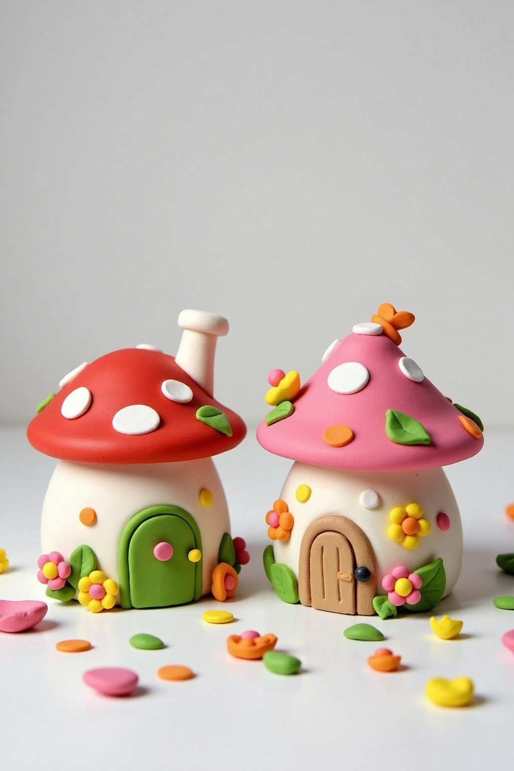 수제 점토 집 모델, 버섯 모양 지붕, 잎사귀 장식, 밝은 색조를 특징으로 하며, 흩어진 점토 자갈과 꽃들에 둘러싸여 있습니다.