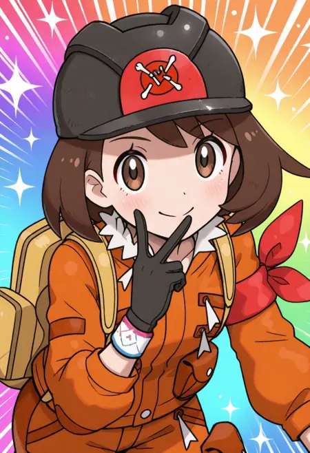 遠征制服、黒いヘルメット、黒い頭部装具、オレンジ色のジャケット、毛皮のフリル、赤いリボン、腕リボン、腕章、オレンジ色のズボン、長袖、黒い手袋、ダイナマックスバンド、ブーツ、茶色の靴、バックパック、茶色の袋