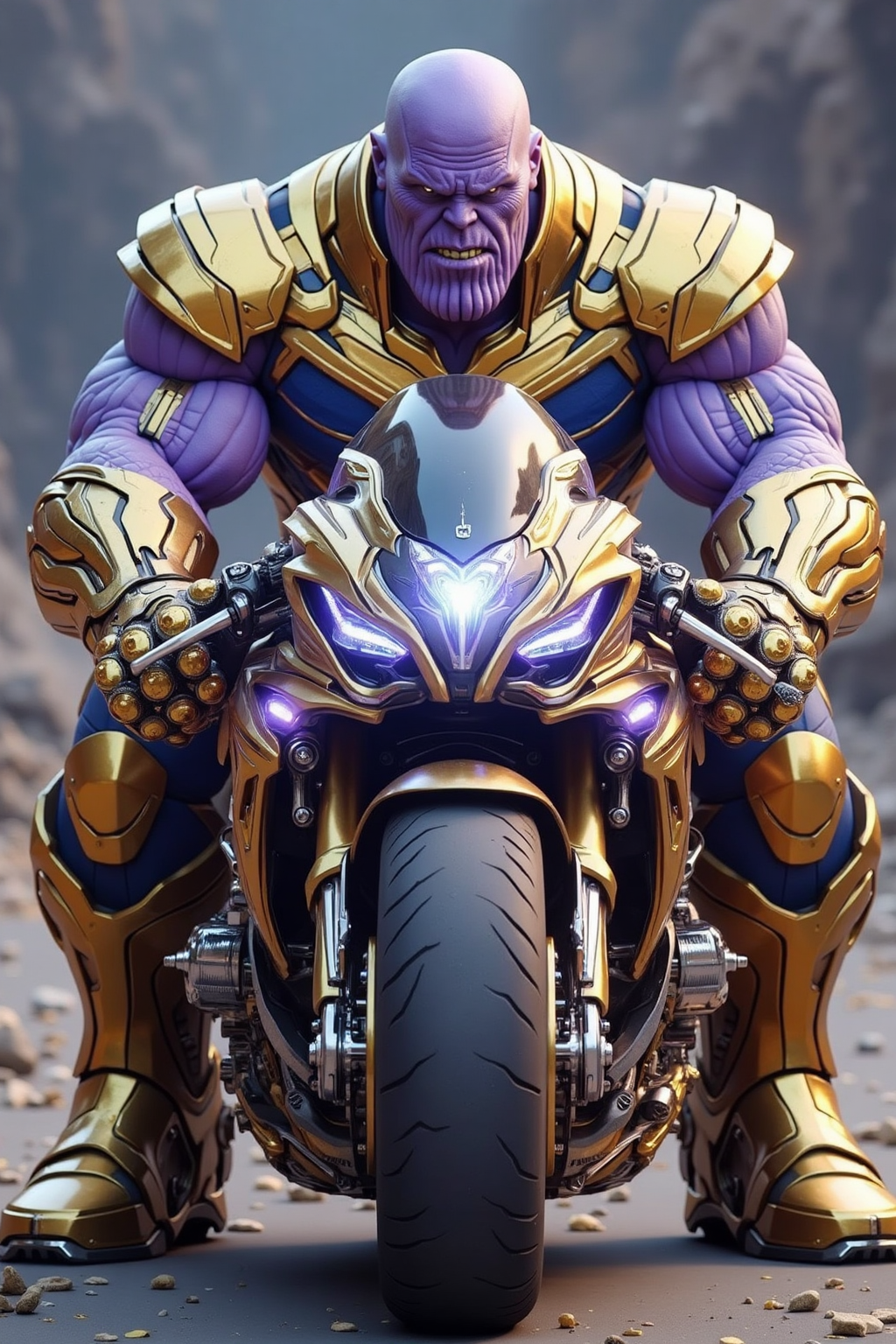 3. 슈퍼히어로/빌런 요소가 결합된 모터사이클, 타노스 스타일, 황금색과 보라색의 지배, 무한의 장갑처럼 생긴 부품, 우주 먼지 효과.