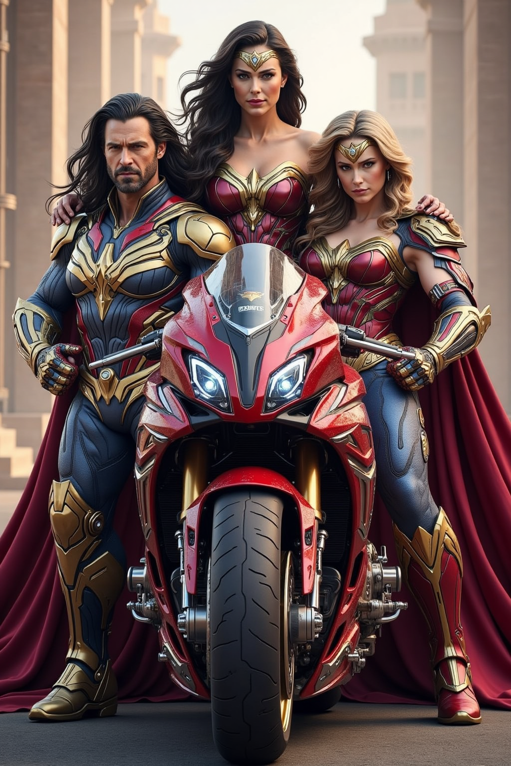 4. 슈퍼히어로/빌런 요소가 결합된 모터사이클, 원더우먼 테마, 빨간색과 황금색, 진실의 채찍 형태의 선, 아마존 신전 배경.
