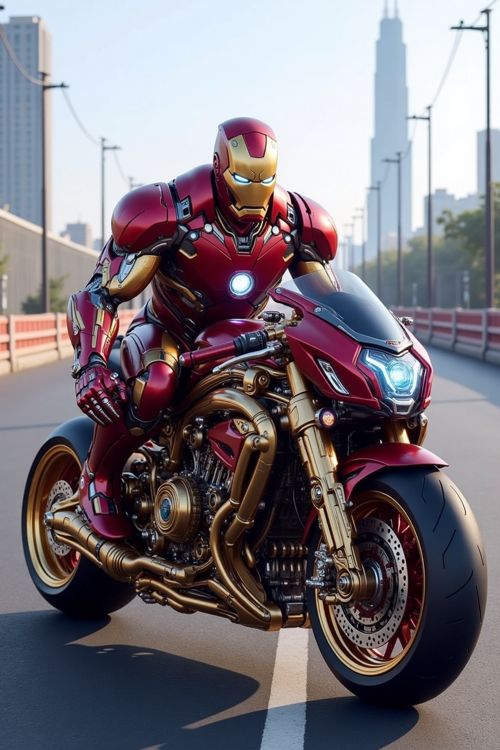 6. 슈퍼히어로/빌런 요소가 결합된 모터사이클, 아이언맨 디자인, 빨간색과 황금색 갑옷, 아크 리액터의 빛, 스타크 타워가 보임.