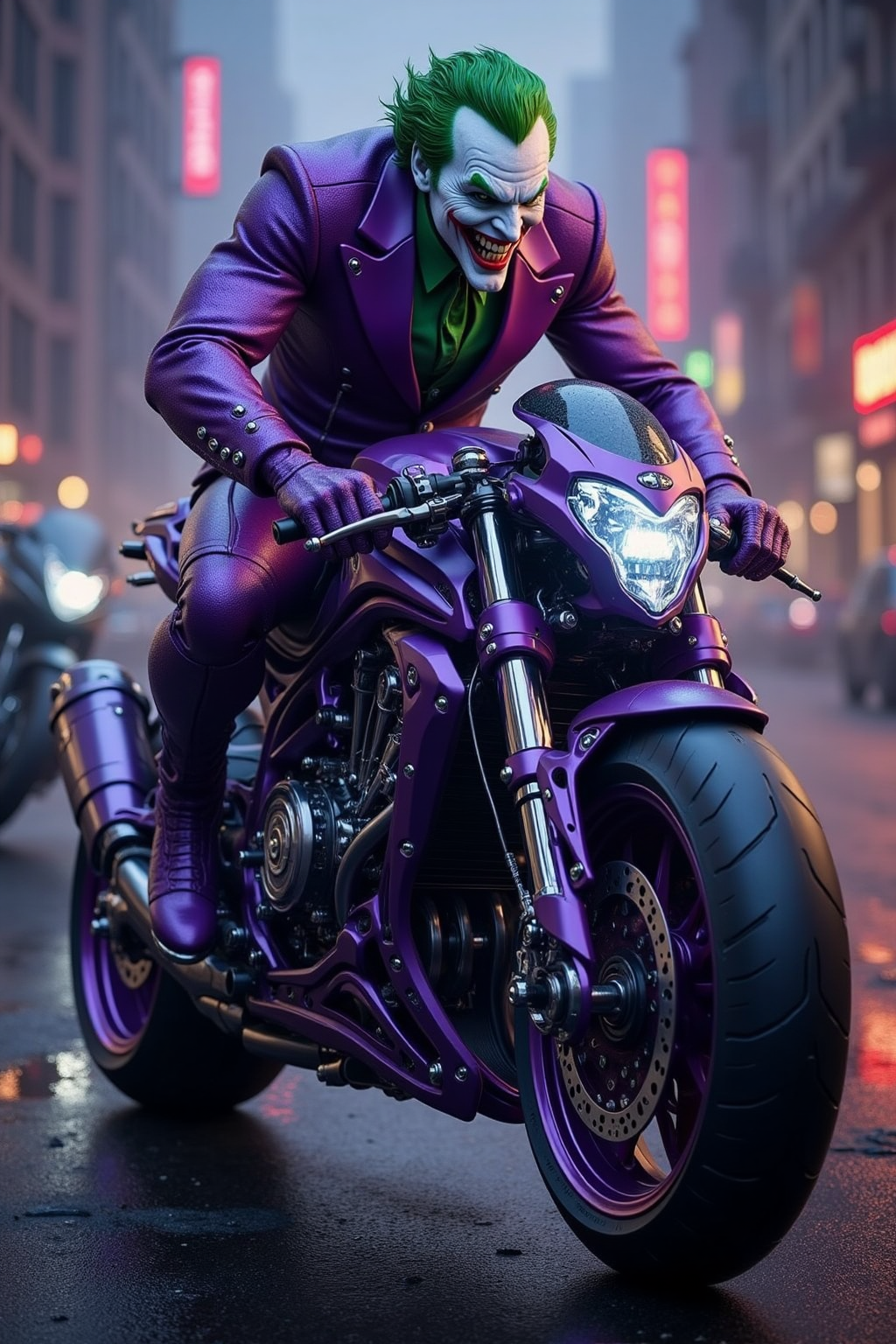2. 슈퍼히어로/빌런 요소가 결합된 모터사이클, 조커 인스파이어드, 보라색과 녹색의 혼란, 웃는 얼굴 디자인, 연기 난 네온 골목 분위기.