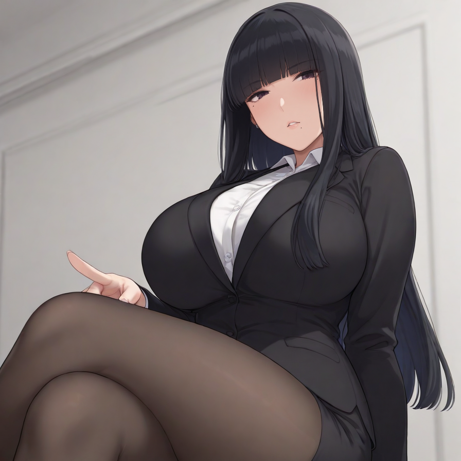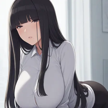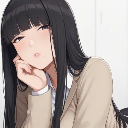 ,rika,hime cut,long hair,black hair,mole under eye,parted lips,mature female