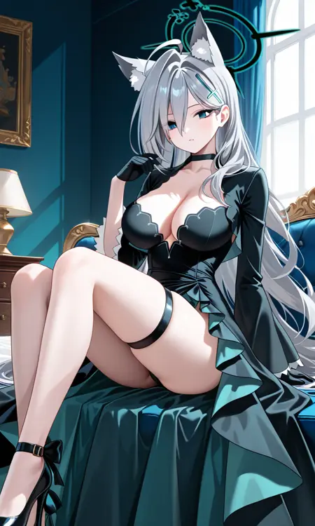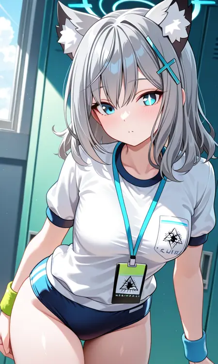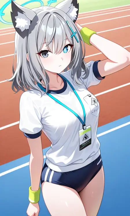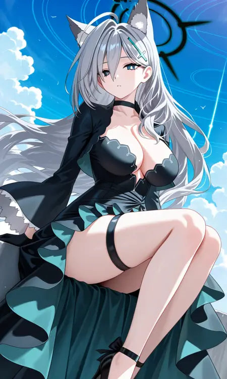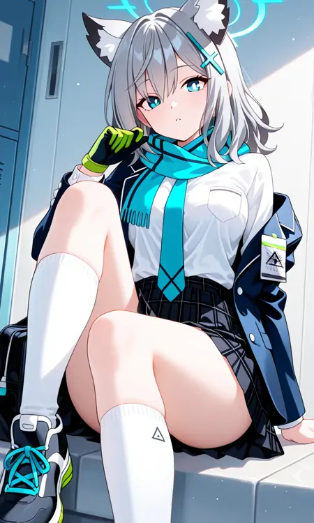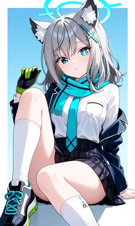 shiroko\(Blue Archive\), 1girl, solo, オオカミの耳, 中くらいの髪, 動物の耳のふわふわ, 動物の耳, 動物の耳, ふわふわ, ふわふわ耳, ハロ, 交差したヘアアドornment, 灰色の髪, ヘアアドornment, 青い目, 不均等な瞳孔, 胸, 中くらいの胸, 大腿, 目の間の髪, オオカミガール, 青いハロ, 逆十字 ヘアアドornment,