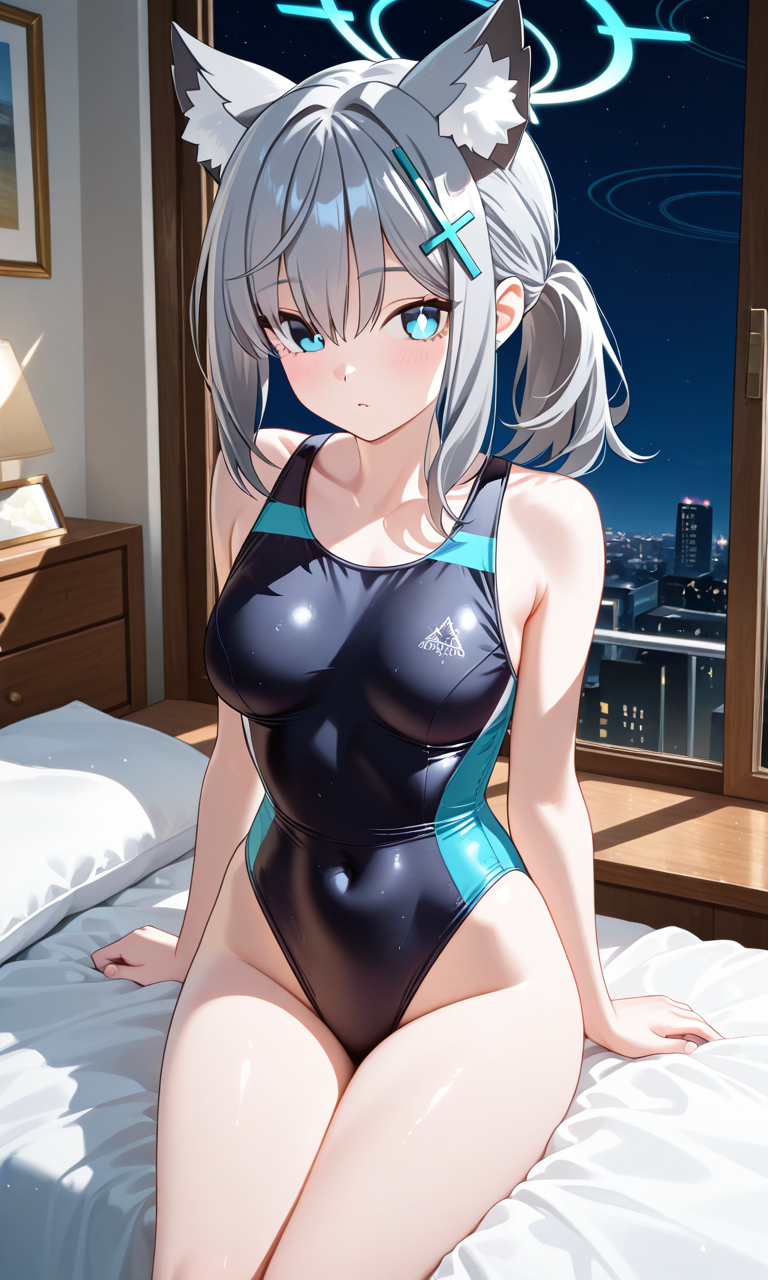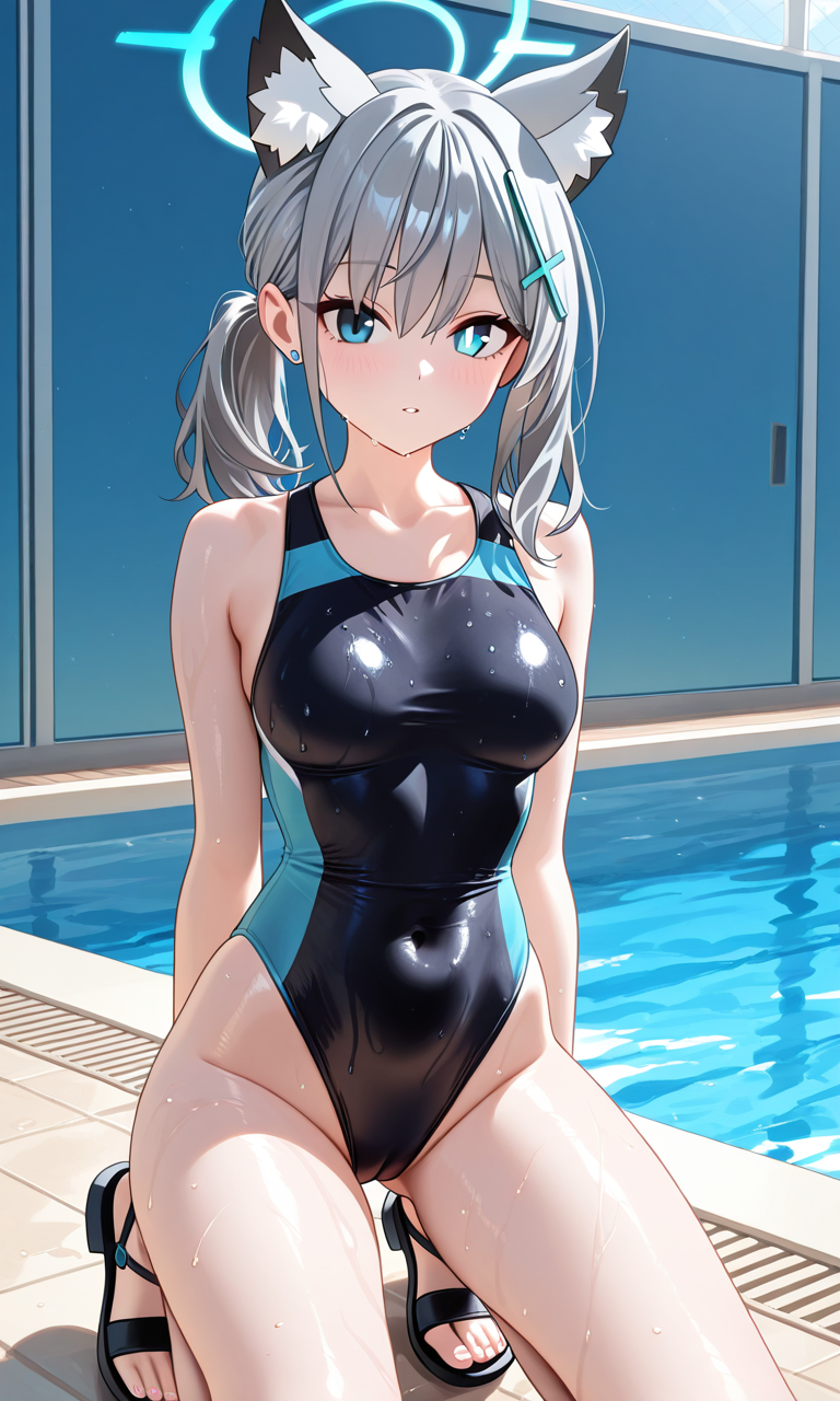 Shiroko summer, 1girl, solo, ポニーテール, オオカミの耳, 動物の耳のふわふわ, 動物の耳, 動物の耳, ふわふわ, ふわふわ耳, ハロ, 交差したヘアアドornment, 灰色の髪, 中くらいの髪, ヘアアドornment, 青い目, 不均等な瞳孔, 胸, 中くらいの胸, 大腿, サイドロックス, 低めのポニーテール, 目の間の髪, オオカミガール, 青いハロ, 逆十字 ヘアアドornment,