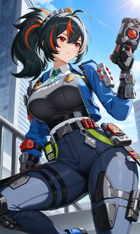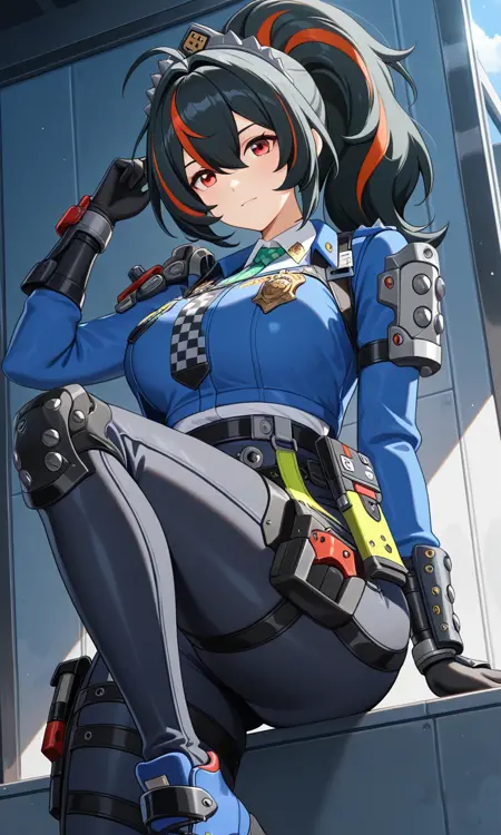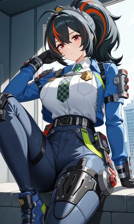 주원(Zenless Zone Zero), 검은 머리, 큰 가슴, 붉은 눈, 붉은 머리, 다색 머리, 줄무늬 머리, 긴 머리, 꼬리머리, 아호게, 눈 사이의 머리카락, 자신감, 두꺼운 허벅지, 파란 재킷, 경찰, 여성 경찰, 경찰 복장, 로보틱 경비원이 있는 검은 하이웨이스트 바지, 어깨 보호대, 별 모양 기호가 있는 앞 벨트, 체크 무늬 넥타이, 검은 장갑, 경찰 배지, 복장, 검은 신발, 손목 보호대, 흰 셔츠, 긴 소매, 경찰 테마, 파란 신발