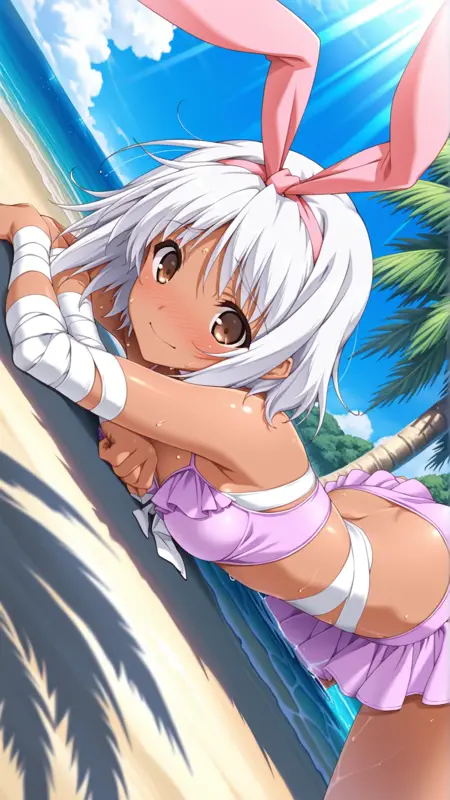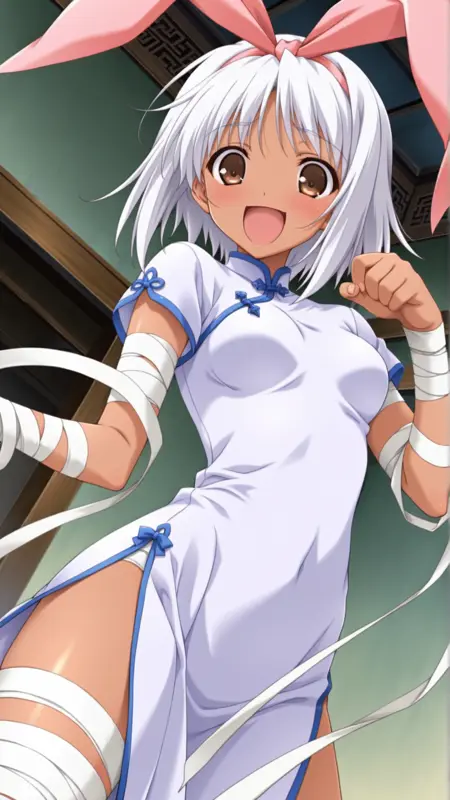 Appearance:brown eyes,white hair, dark-skinned female, bandages,