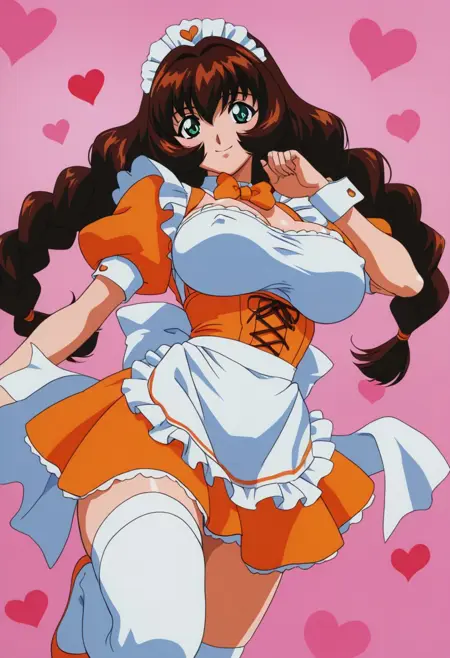 Outfit 02: waitress, maid headdress, orange dress, huge cleavage, orange corset,white apron, wrist cuffs, puffy short sleeves, orange neck bow, white thigh-high socks,