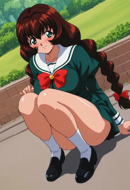 Trigger: Marin_Nonohara, brown_hair, huge twin braids, green eyes, huge_breasts, wide hips,