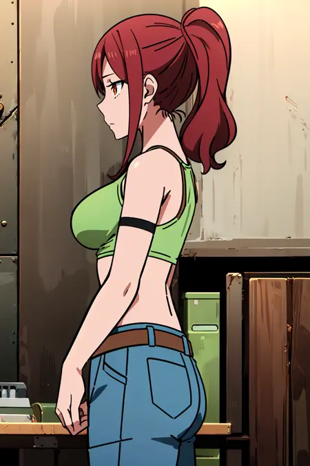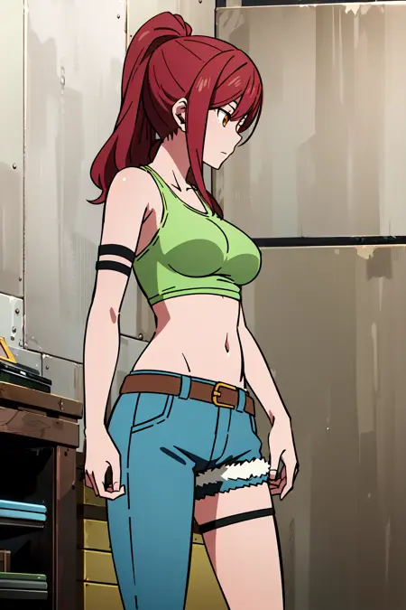 デニム、非対称な服、片方のズボンの腿部分、ベルト、ズボン、ジーンズ、太ももストラップ、タンクトップ、肩出し、アームバンド、シャツ、非対称な脚部の服