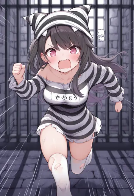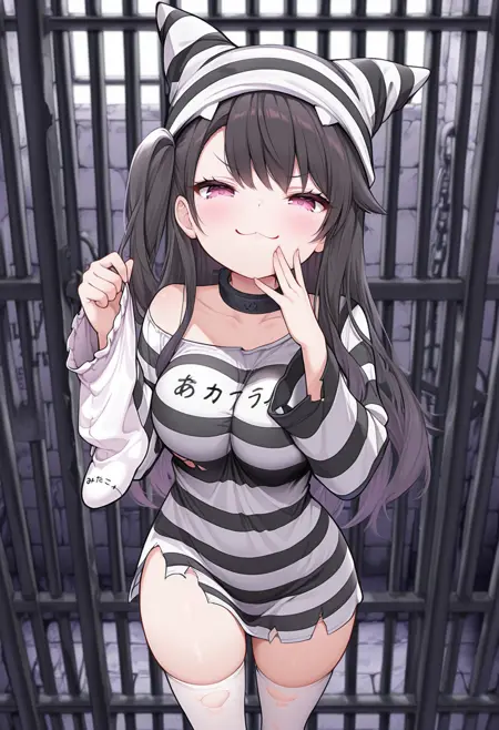 흰 허벅지 양말, 줄무늬, 감옥 복장, 줄무늬 두건, 찢어진 옷,