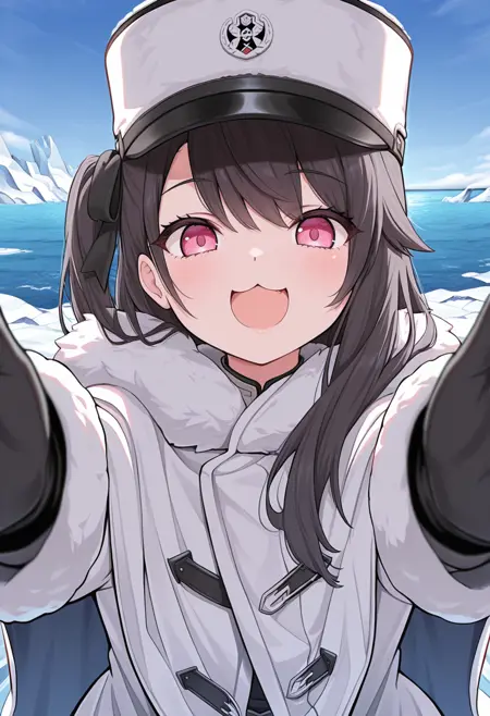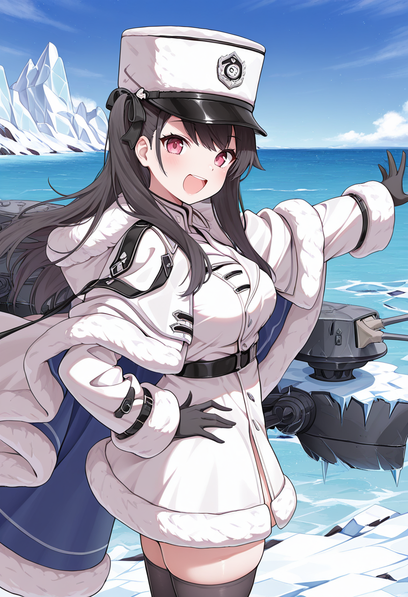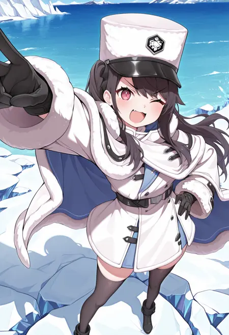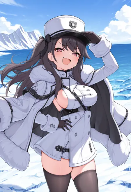 검은 허벅지 양말, 모피 트림, 어깨에 두른 코트, 흰색 모자, 케피, 장갑, 사이드부브,