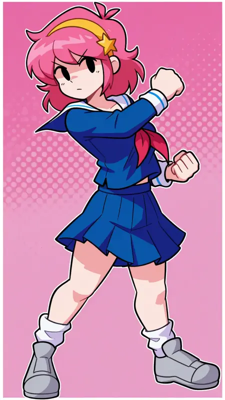AthenaAsamiyaFNF, 1girl, pink hair, yellow headband, blue sailor uniform, light blue collar, red neck ribbon, light grey shoes, Black eyes, no sclera, blue pleated skirt, white socks