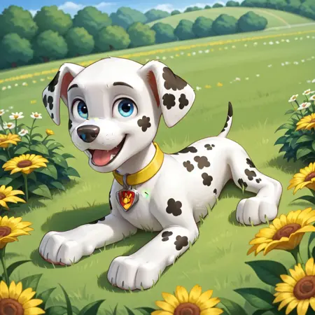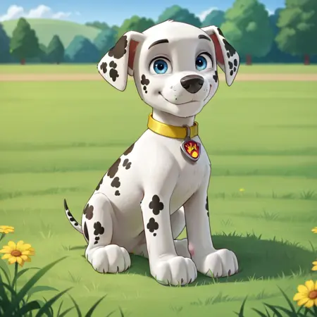 dog, dalmatian, white and black fur, spotted fur, blue eyes, black nose, dog ears, dog tail, yellow collar, red dog tag,