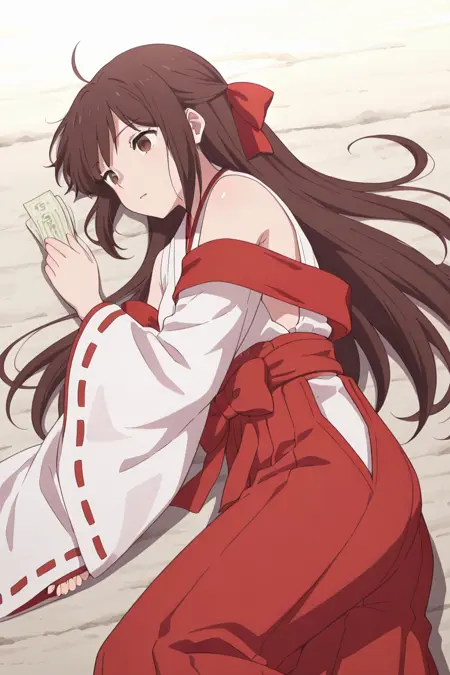 miko963outfits, japanese clothes, miko, kimono, bow, detached sleeves, wide sleeves, hair bow, red hakama skirt, ribbon-trimmed sleeves, bare shoulders, sleeveless, red fabric flows from the skirt,