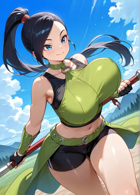 boots, gloves, fingerless gloves, crop top, waist cape, navel, large breasts, black shorts, midriff, black gloves, high heel boots, bare shoulders, green choker, o-ring top