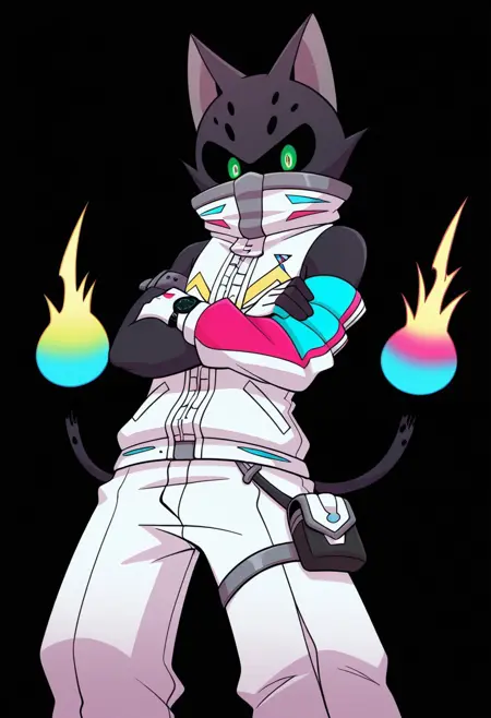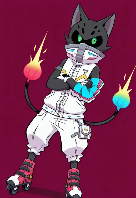 solo, male, anthro cat, black spots on forehead, black nose, black goggle-shape eyes, green gloomy pupils, thick black outlines, black outlines, flame tipped tail, two tails, gray trimmed high collar covering mouth, white zipper sleeveless jacket, white baggy pants, magenta skates, white glove on left hand, multi-colored sleeve on right arm, black watch on right arm