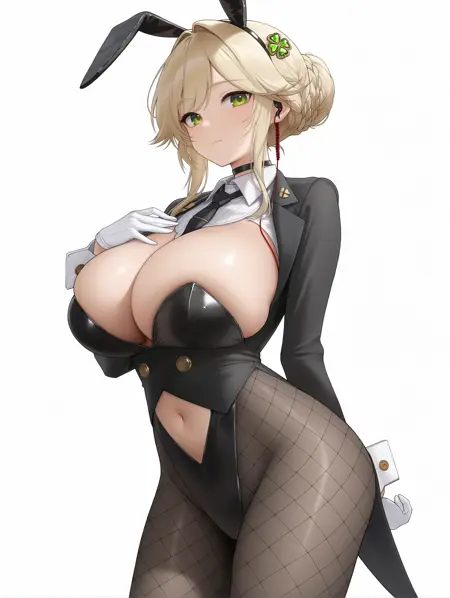IL_Ade Agent Bunny,1girl,solo,hair bun,blonde hair,long hair,single hair bun,bun with braided base,hair intakes,sidelocks,braid,green eyes,cleavage,huge breasts