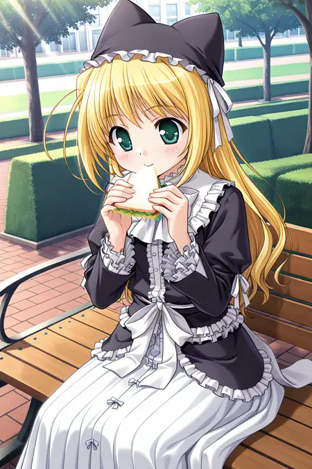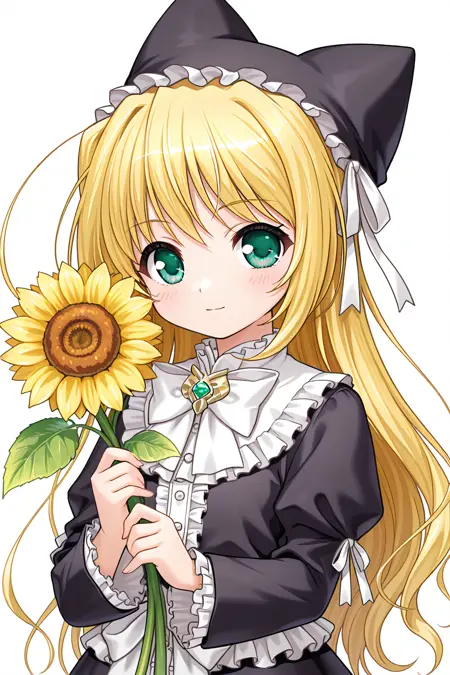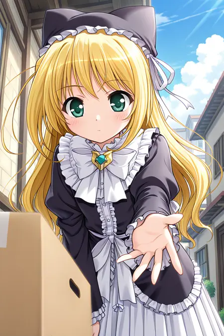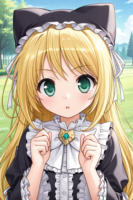 mob cap,white headwear,cat ears,fake animal ears,hat ribbon,black ribbon,raincoat,white cape,see-through,frilled collar,center frills,black jacket,frilled jacket,juliet sleeves,wide sleeves,arm ribbon,frilled sleeves,brooch,green gem,white bowtie,white bow,white ribbon,waist ribbon,back ribbon,white skirt,skirt bow,long skirt,pleated skirt,blu
