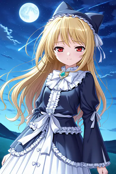 fiacca marguerite,red eyes,tsurime,blonde hair,very long hair,wavy hair,huge ahoge,sidelocks,petite,child,