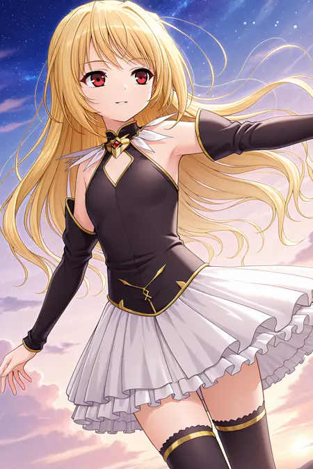 no headwear,turtleneck,feather collar,black dress,brooch,red gem,cleavage cutout,bare shoulders,detached sleeves,long sleeves,white skirt,miniskirt,frilled skirt,layered skirt,zettai ryouiki,black thighhighs,thigh strap,