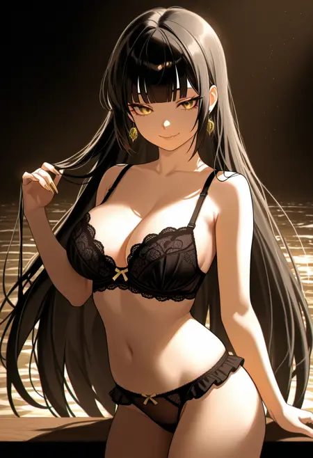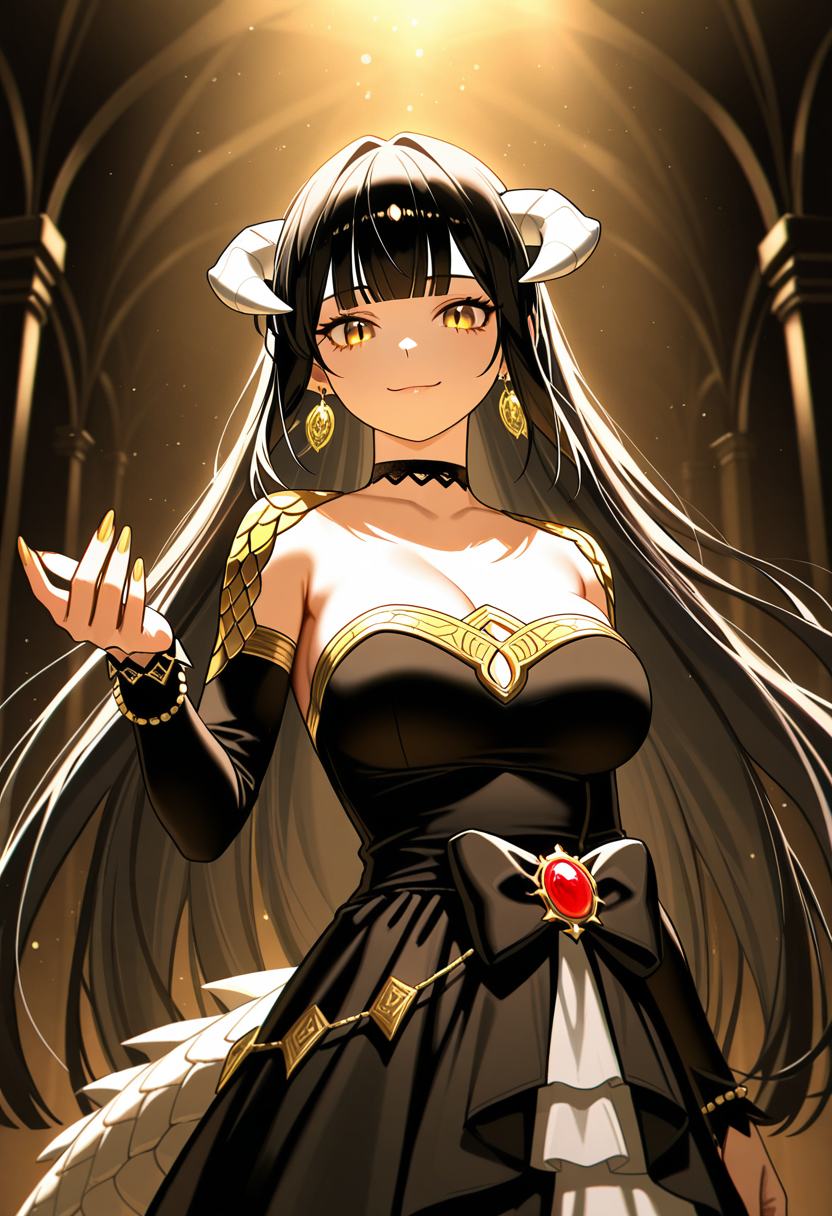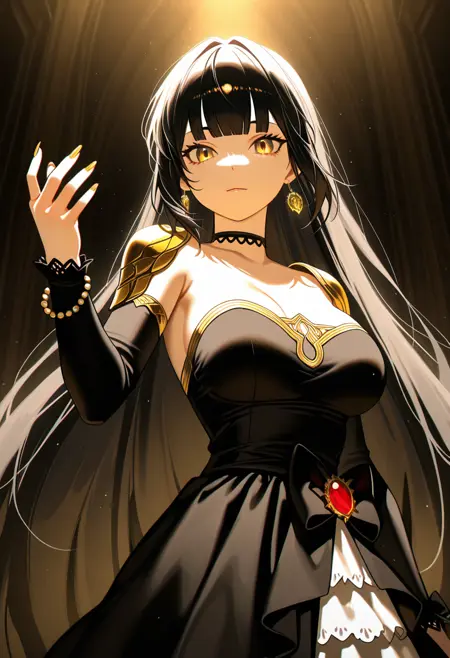 默认面部:iblis01,1个女孩,黑色直长发,齐刘海,金色眼睛,锐利目光,小巧鼻子,细眉,长睫毛,清晰的下颌线,细致的发丝,金色耳环,长而尖锐的金色指甲,长而尖锐的金色指甲,头上白色弯曲角