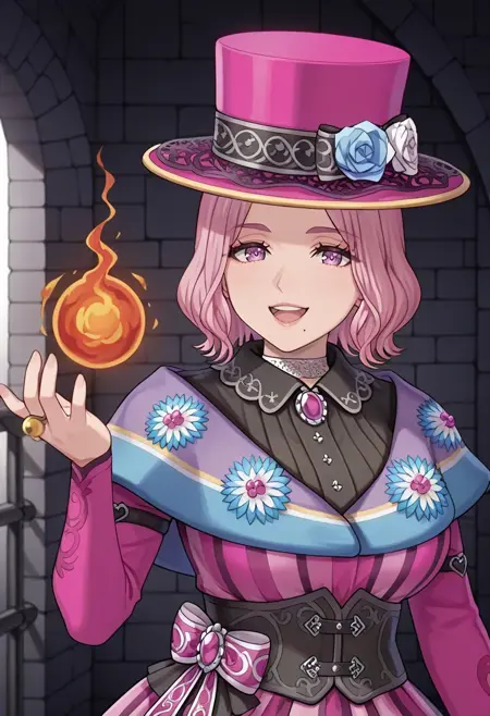 玫瑰:长袖,束身衣,胸针,帽饰花,戒指,项圈,高顶帽,马尾,长发,圆环耳环,粉色连衣裙,粉色头饰,黑色上衣,紫色短斗篷