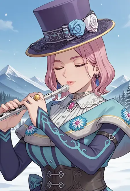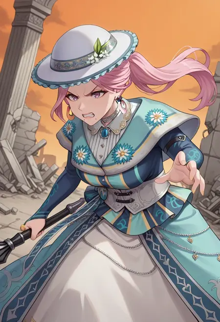 鸢尾:长袖,束身衣,胸针,帽饰花,戒指,项圈,长发,圆顶帽,马尾,圆环耳环,粉色连衣裙,紫色头饰,黑色上衣,紫色短斗篷