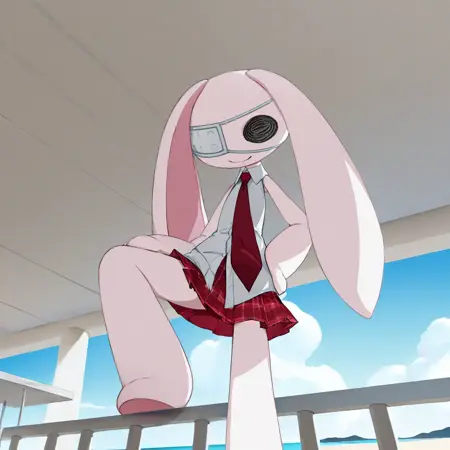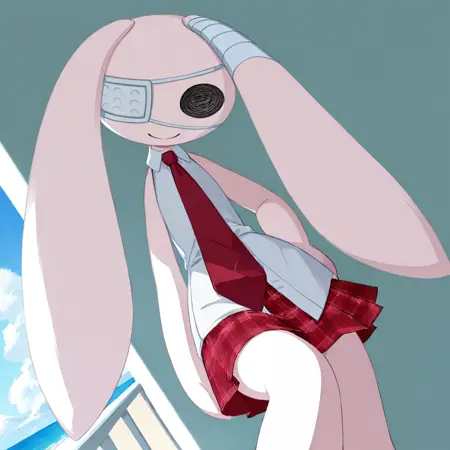 인간형, 여자, 살아있는 블러시, 거대한 귀, 귀 아래로, 휘갈긴 눈, 흰 털, 소매 없는 흰 셔츠, 빨간 체크 치마, 흰 눈 보호대,