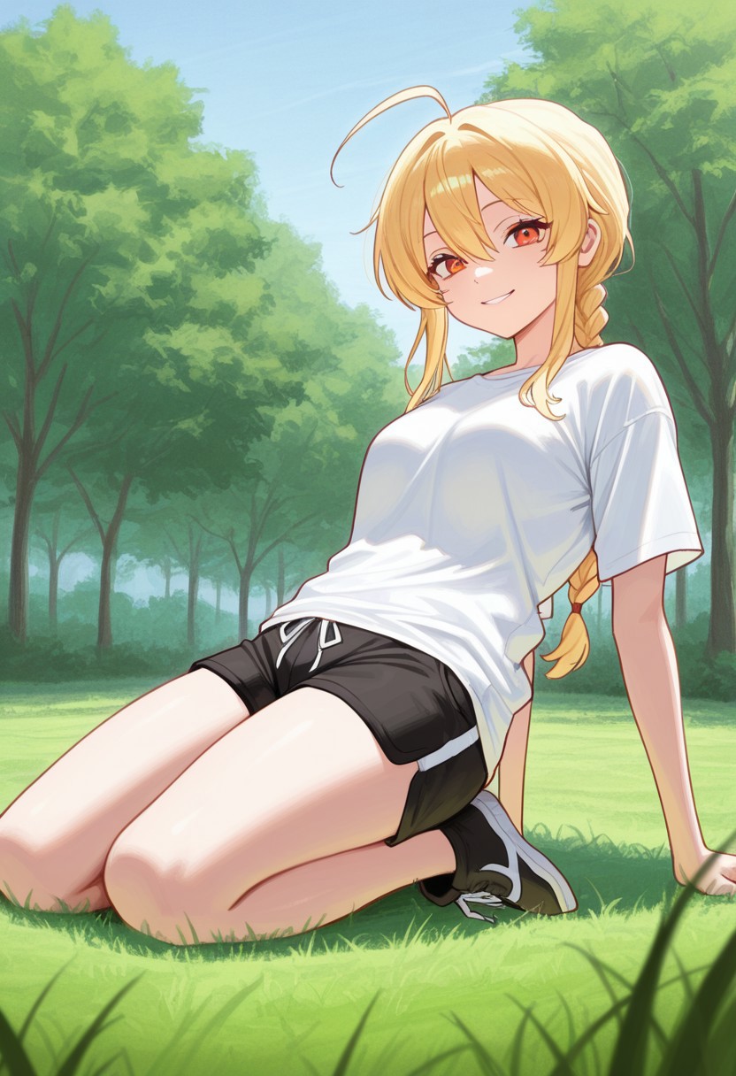 solo, 1girl, blonde hair, orange eyes, single braid, white t-shirt, back shorts, d1ngd0ng_pose, knee on ground, leaning back, looking at the viewer, full body, smile, grass, sky, trees, masterpiece, 4k resolution