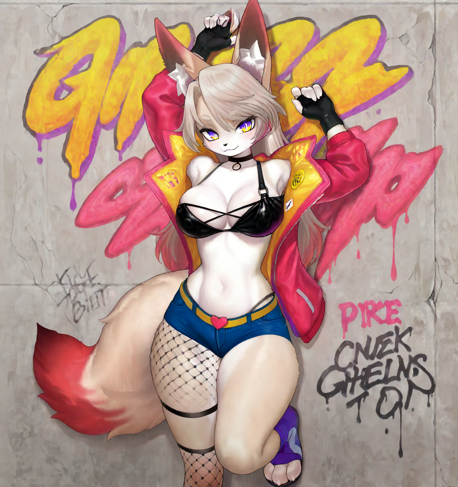 人形,毛茸茸,女性,Refantasia皮肤,浅棕色毛发,粉色眼睛,细眉毛,紫色眼睑,金色头发,朋克发型,黄色尾巴,粉色指甲,黄色夹克,短款高领,朋克裙,无脚趾靴,(不对称渔网袜)