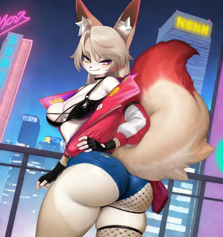 人形,毛茸茸,女性,浅棕色毛发,浅棕色头发,长发,耳内绒毛,多彩眼睛,紫色眼睛,黄色眼睛,黑色鼻子,尾巴,项圈,夹克,黑色胸衣,无指手套,牛仔短裤,单腿渔网袜,无脚趾鞋履,