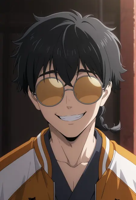1boy, male focus, solo, green eyes, sunglasses, black hair, short ponytail, braided ponytail, collarbone, samue, black shirt, letterman jacket, white and orange jacket, open jacket, black pants, geta,