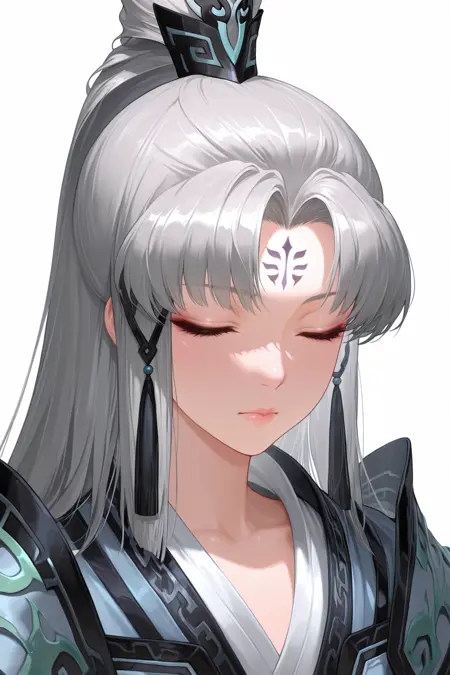 caogu, 1girl, solo, forehead mark, long hair, facial mark, hair ornament, lips, grey hair, ponytail, portrait, chinese clothes, closed eyes, armor, upper body, white background, closed mouth, bangs, petite body, parted bangs