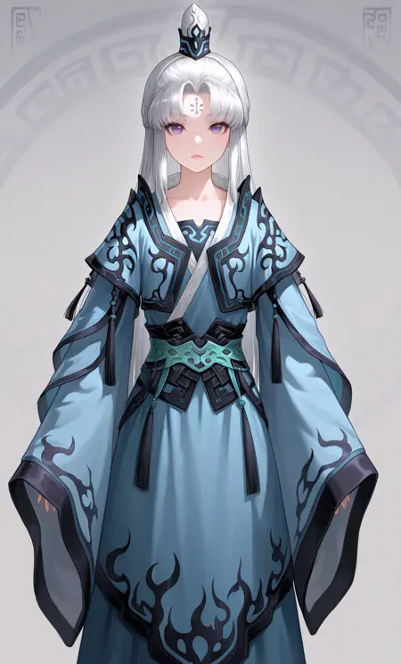 caogu, 1girl, purple eyes, solo, forehead mark, chinese clothes, facial mark, looking at viewer, long sleeves, standing, sleeves past wrists, white hair, hanfu, grey hair, petite body, lips, wide sleeves, parted bangs