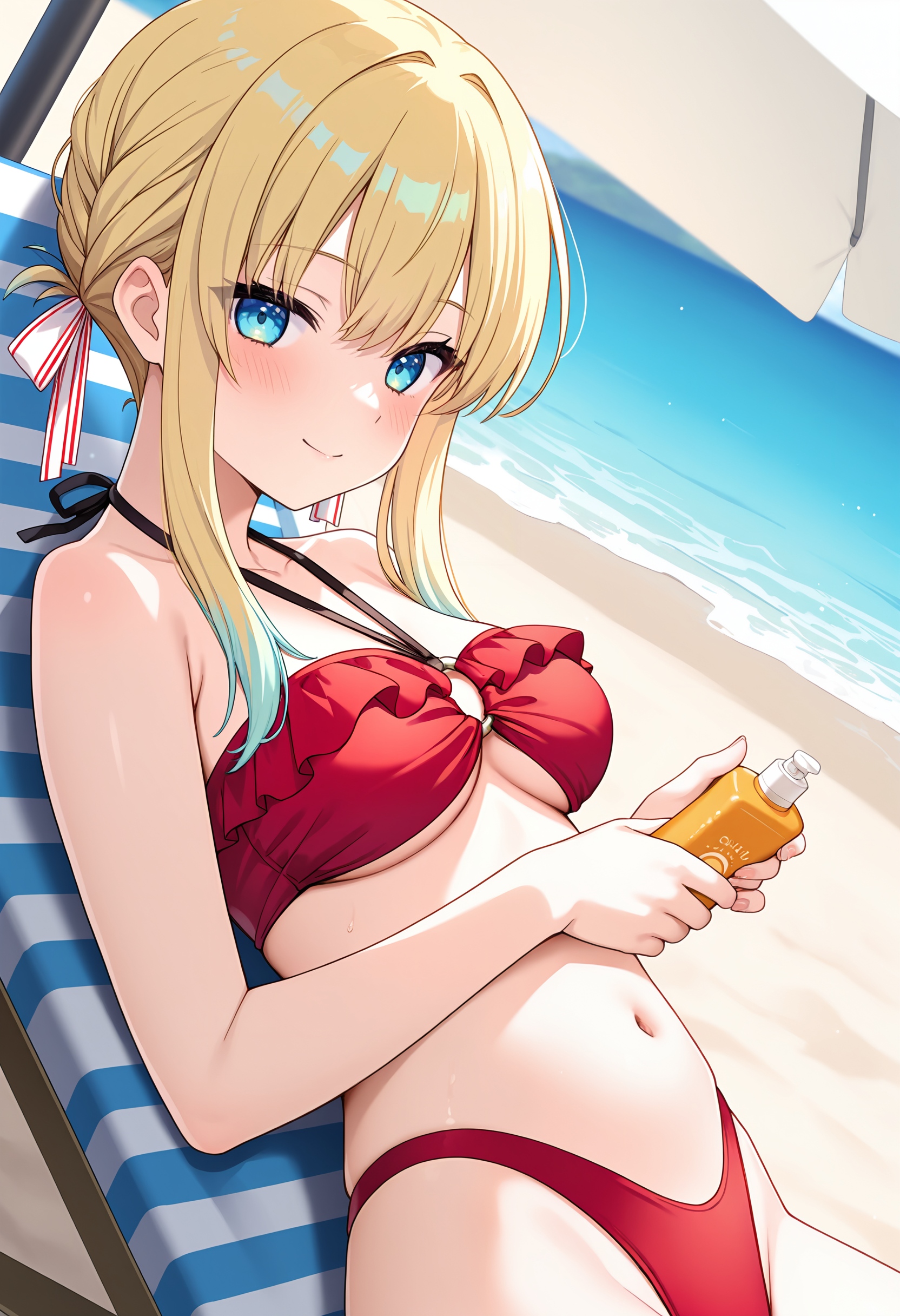 YONGYI,1girl,solo,blonde hair,short hair,sidelocks,hair ribbon,red bikini,o-ring top,halterneck,red frills,highleg bikini,
