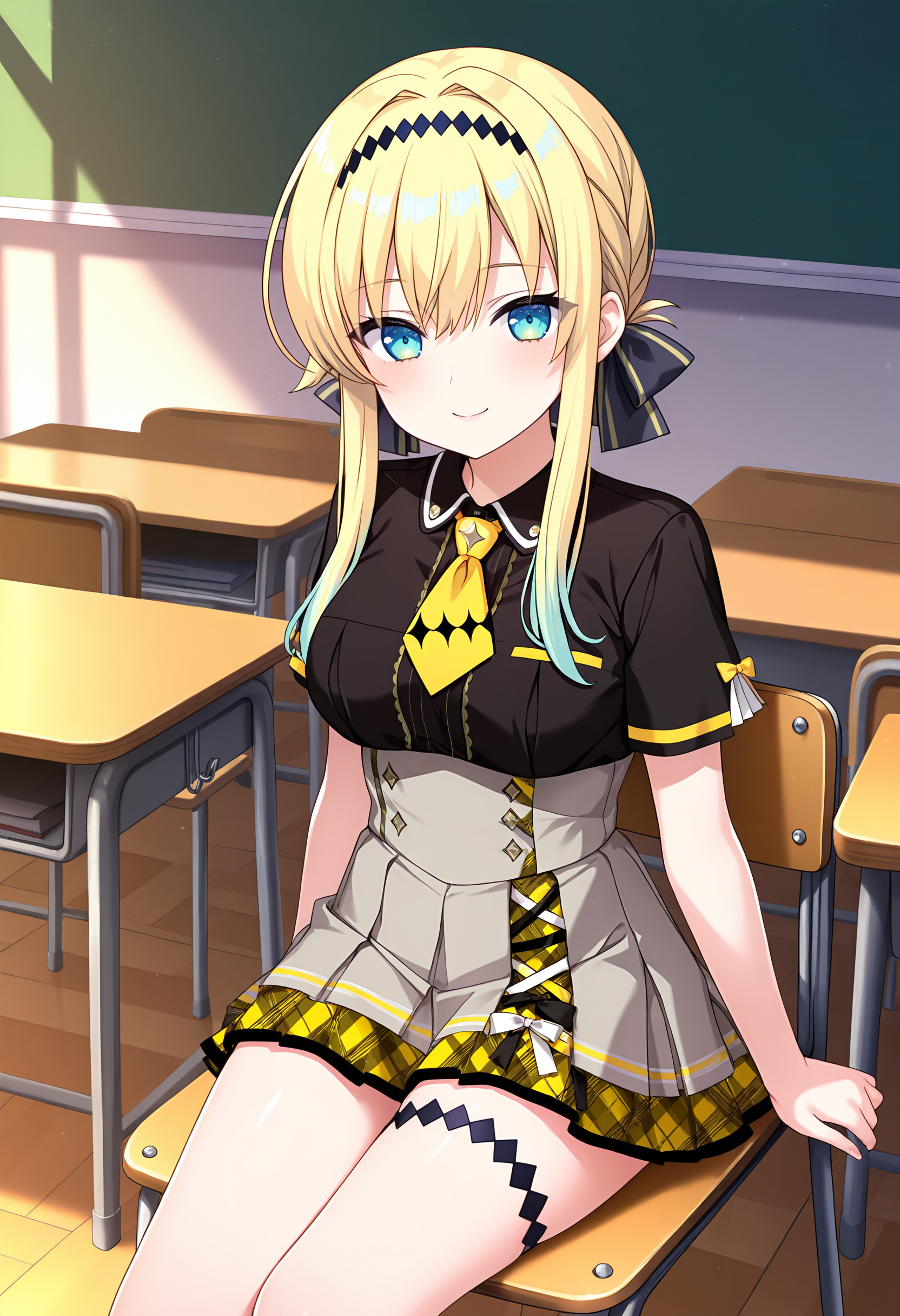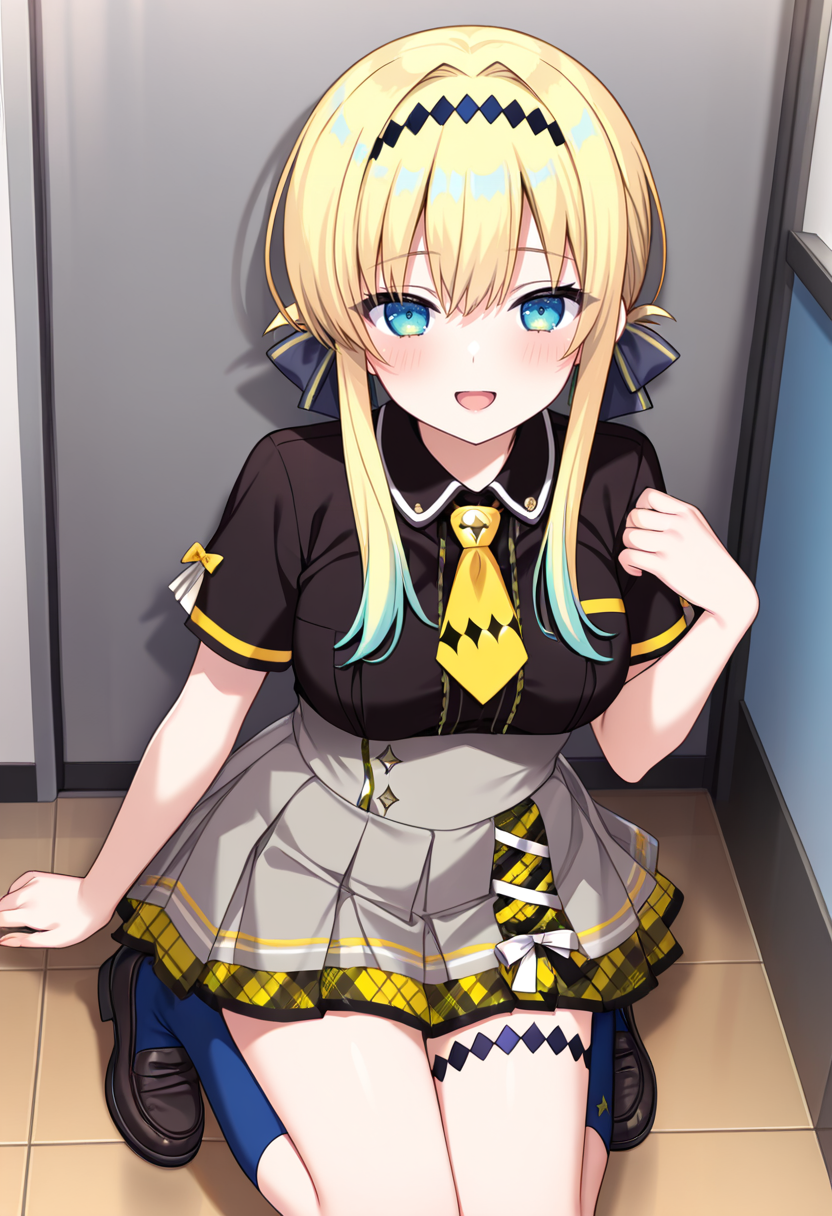 XIAOFU,1girl,solo,blonde hair,short hair,sidelocks,hair bow,grey high-waist skirt,black shirt,short sleeves,collared shirt,black hairband,thigh strap,plaid,yellow necktie,