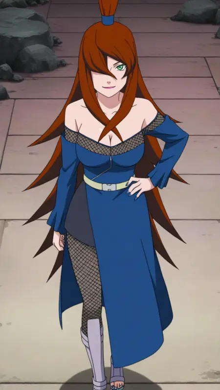 青いドレス、サイドスリット、黒いスカート、フィッシュネット、フィッシュネットパンツホース、シルバーのブーツ、つま先開きの靴、緑のベルト、胸、大きな胸、谷間、肩出し、ネイルポリッシュ、