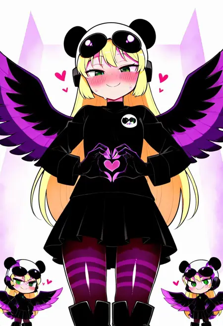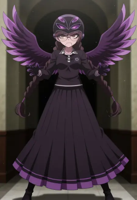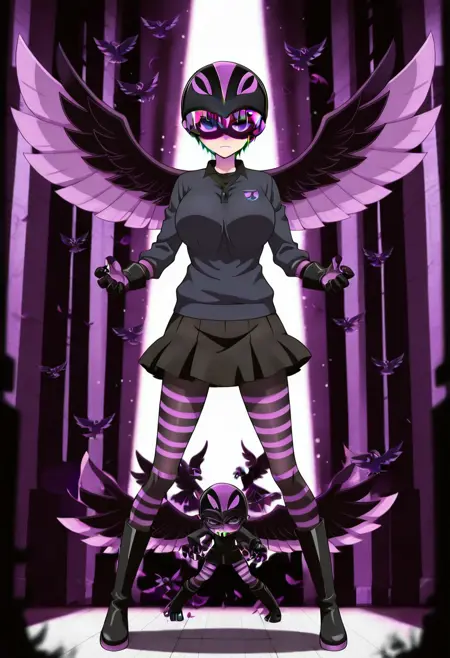 黑色圆领短袖上衣,黑色短裙,黑色头盔带有紫色细节,头盔内露出紫色眼睛,面罩使眼睛和面部外露,长袖,紫色爪形手套,翅膀从裙子后方延伸,紫色鸟翼,黑色长靴,黑色连裤袜上有闪亮的紫色条纹