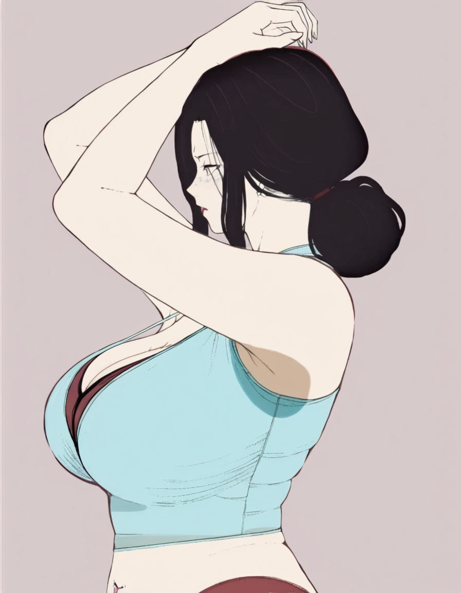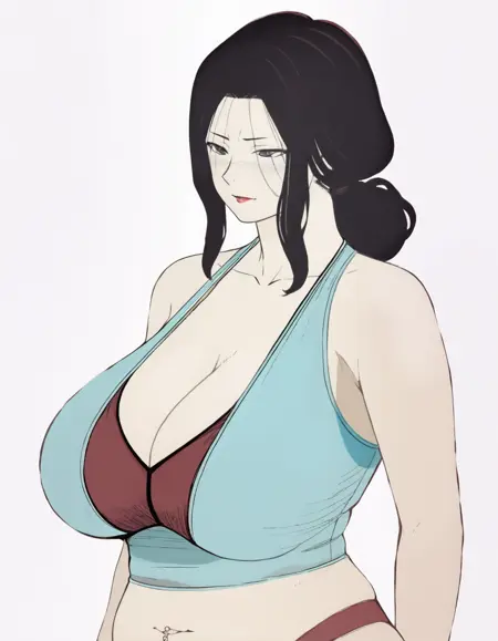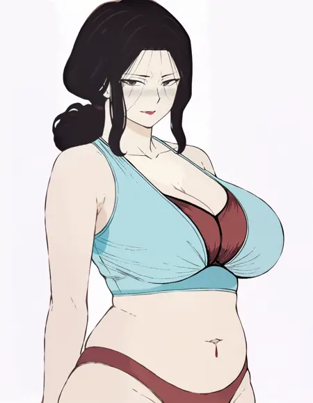 트리거 단어: 3tuzan, 성숙한 여성, 어두운 머리카락, 파란색 상의, 소매 없음, 가슴 선, 빨간 속옷, 유혹적인 자세