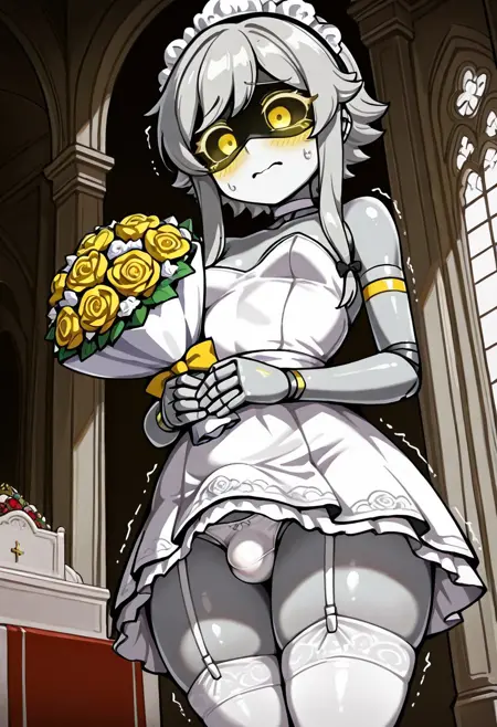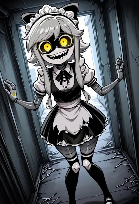 Prompts: CynMD, 1girl, solo, maid, maid headdress, robotic, android, yellow eyes, colored sclera/mask, bow/hair bow, striped thighhighs, sidelocks, gray/blond/white hair (try experimenting with hair color to see which one you like the most), masterpiece, absurdres.