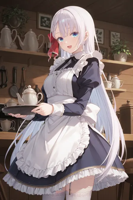 maid_outfit、白ハイソックス、メイド、エプロン、ロングスリーブ、フリル、ガーターストラップ、ジュリアットスリーブ、ふわふわ袖、黒リボン、ドレス、
