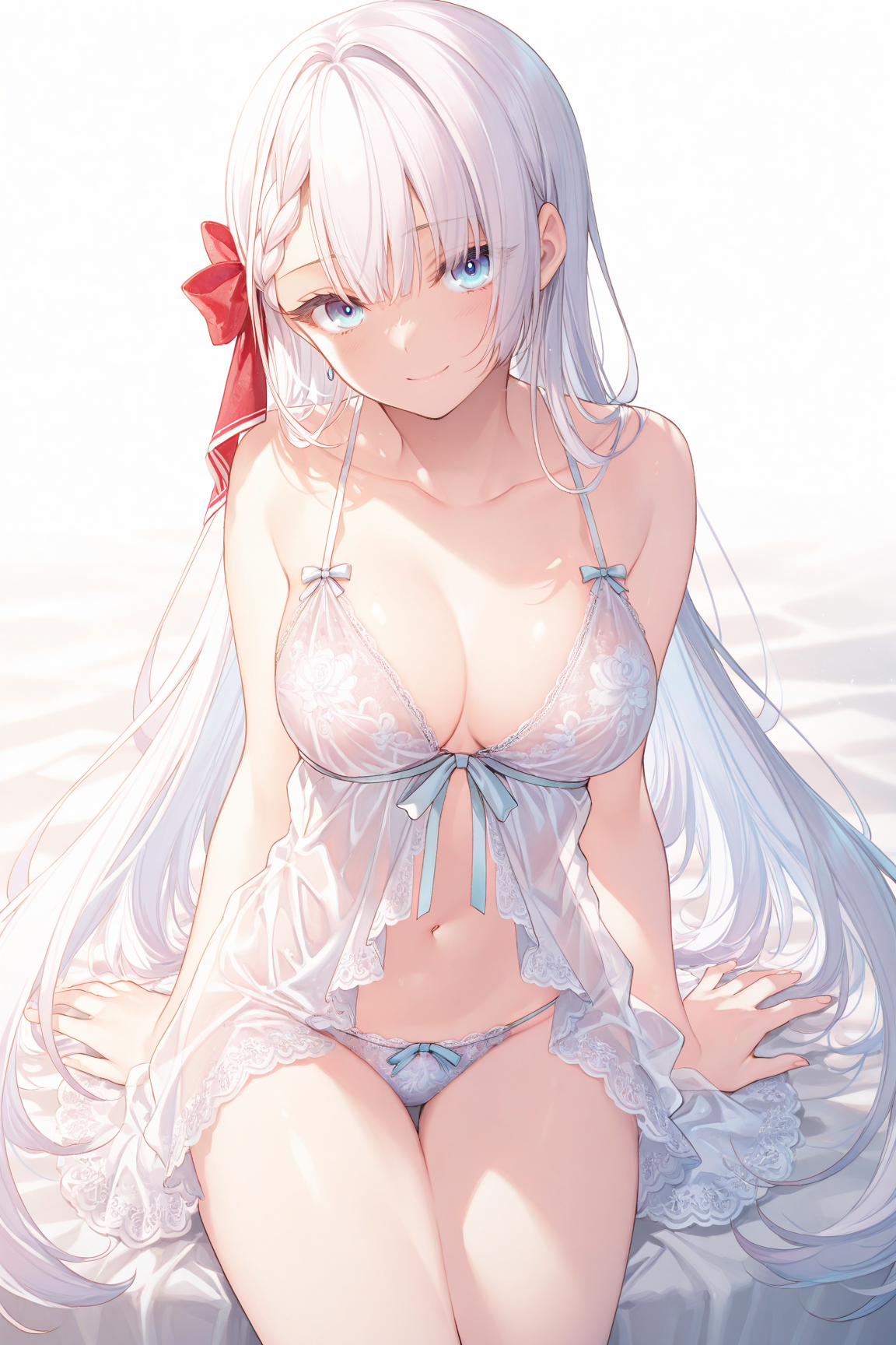 white_babydoll, see-through, navel, cleavage, lingerie, bare shoulders, collarbone, underwear, thighs, bare_arms, stomach,
