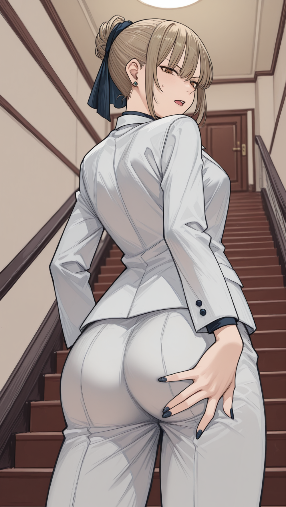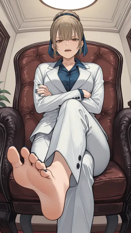 흰색 정장, 폼팔, 파란색 칼라 셔츠 (선택 사항)