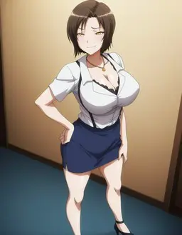 1girl large breasts high heels skirt short hair brown hair yellow eyes cleavage underwear necklace