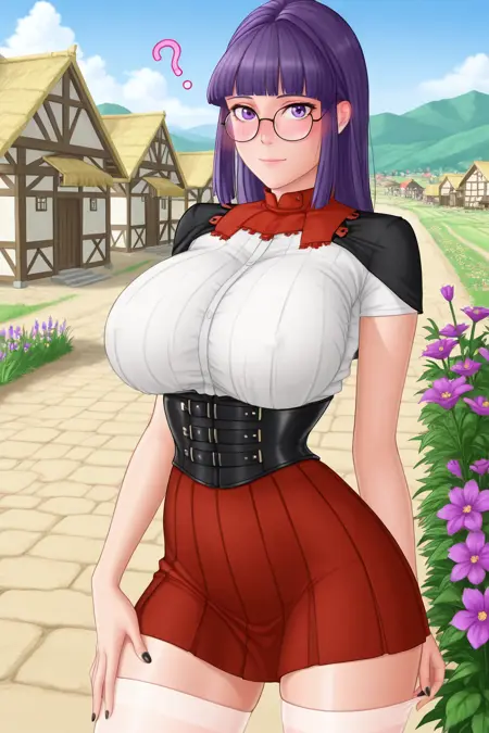 Rina, long hair, purple eyes, purple hair, glasses, blunt bangs, hime cut, blunt ends, white shirt, short sleeves, pleated skirt, miniskirt, white thighhighs, uniform, capelet, red skirt, underbust, black corset, ankle boots, high heels, black footwear