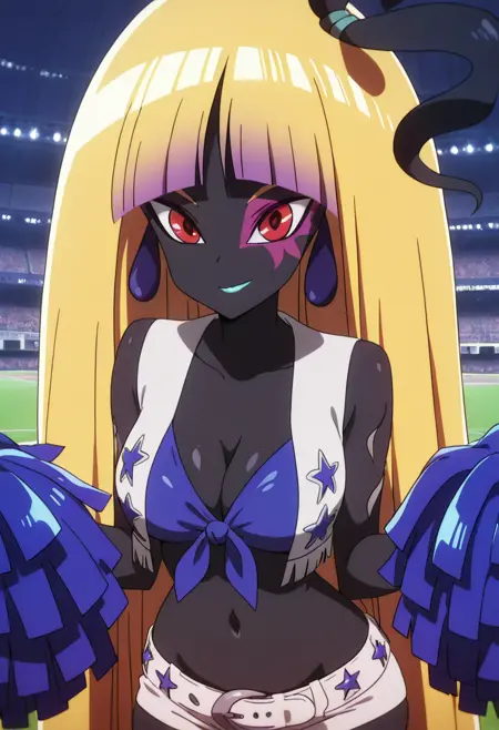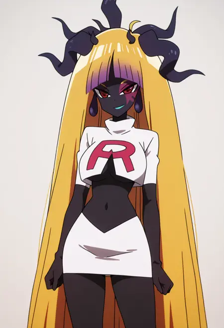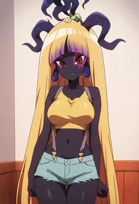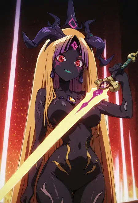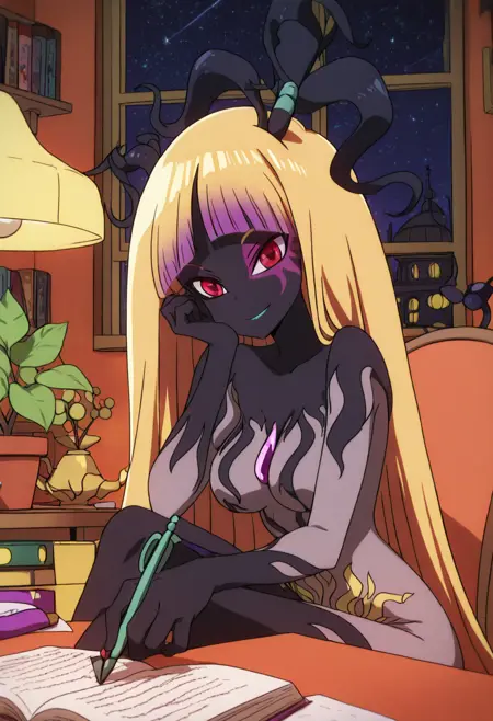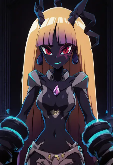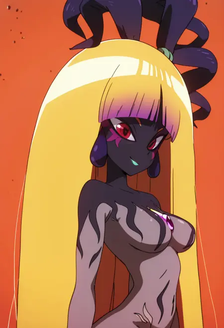 zzMadHatter, 색상이 있는 피부, 긴 머리카락, 검은 피부, 붉은 눈, 금발, 뿔, 긴 머리카락, 다색 머리카락, 주황색 머리카락, 보라색 머리카락, 큰 가슴,