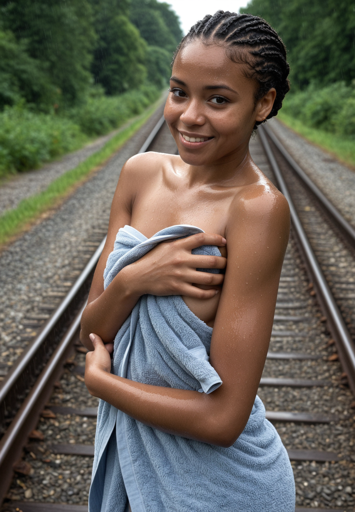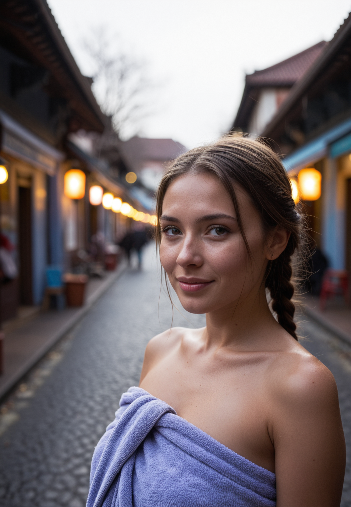 我们的女士刚洗完澡,用一条裹在身上的毛巾遮盖着自己。