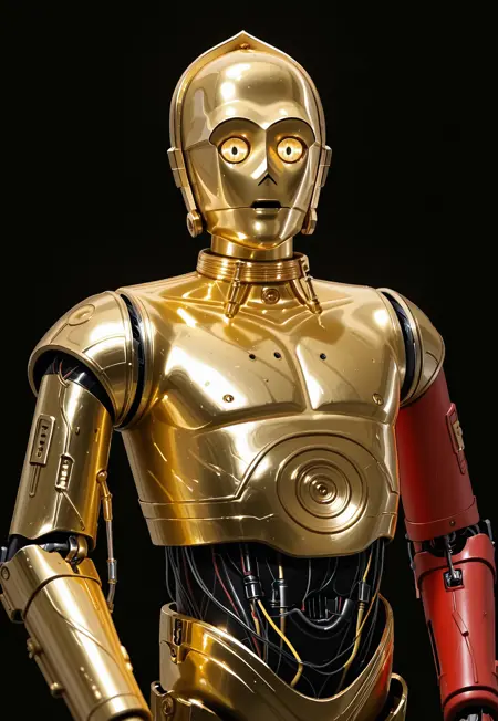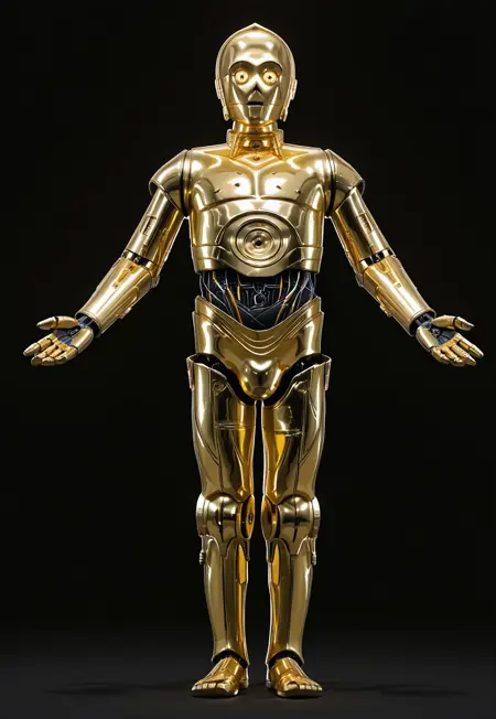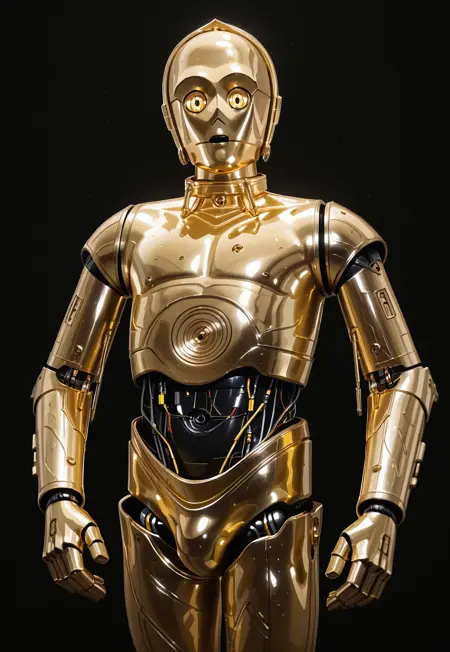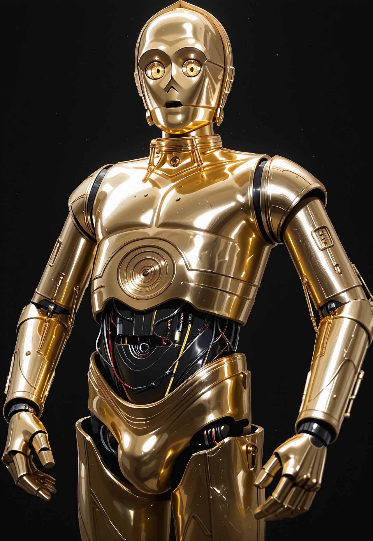 # c3po,机器人,男性机器人,金色金属皮肤,金色发光眼睛,黑色腰腹带线路,